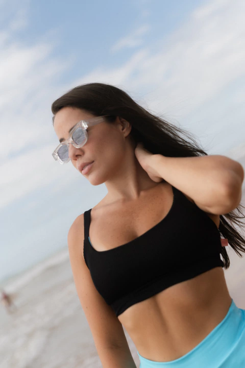 O top possui um decote aberto em formato de U na frente e nas costas, todo duplo e sempre com duas cores na frente, possui design moderno e sofisticado. Elástico interno nas alças e na pala, além de possuir entrada lateral pra bojo (não acompanha o produto). Ideal para exercícios de alto impacto. Tecido com leve compressão, uma cintilância discreta e toque macio.